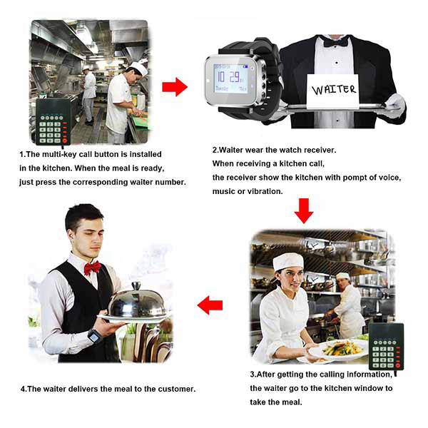 El sistema de llamada de cocina adopta tecnología inalámbrica, conectando al camarero y al chef juntos. es ampliamente utilizado en la cocina para que el chef se comunique con el personal de servicio cuando la comida está lista. El El sistema de llamada de cocina es un dispositivo de búsqueda, que te permite llamar fácilmente al servidor para enviar comida, por lo tanto creats un ambiente de servicio más acogedor. Este el sistema le ayuda para ser más productivo al reducir mala comunicación entre el personal de cocina y el personal de servicio, así como para prevenir el servicio de alimentos fríos. no es necesario gritar para crear un ambiente agradable, realzar la imagen del restaurante y mejorar negocio.