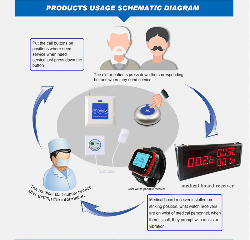 El sistema de llamada a enfermeras del hospital es ampliamente utilizado en hospitales, clínicas, ancianos casa y así sucesivamente. campana de llamada de enfermera consta de botón para uso del paciente y receptor de señales para enfermera o médico uso. Cuando el paciente necesita ayuda, ellos simplemente presione el botón , el número de cama se mostrará en el receptor de la pantalla de visualización con "Dingdong" sonido. para que la enfermera y el doctor pudieran ofrecemos ayuda muy oportuna.