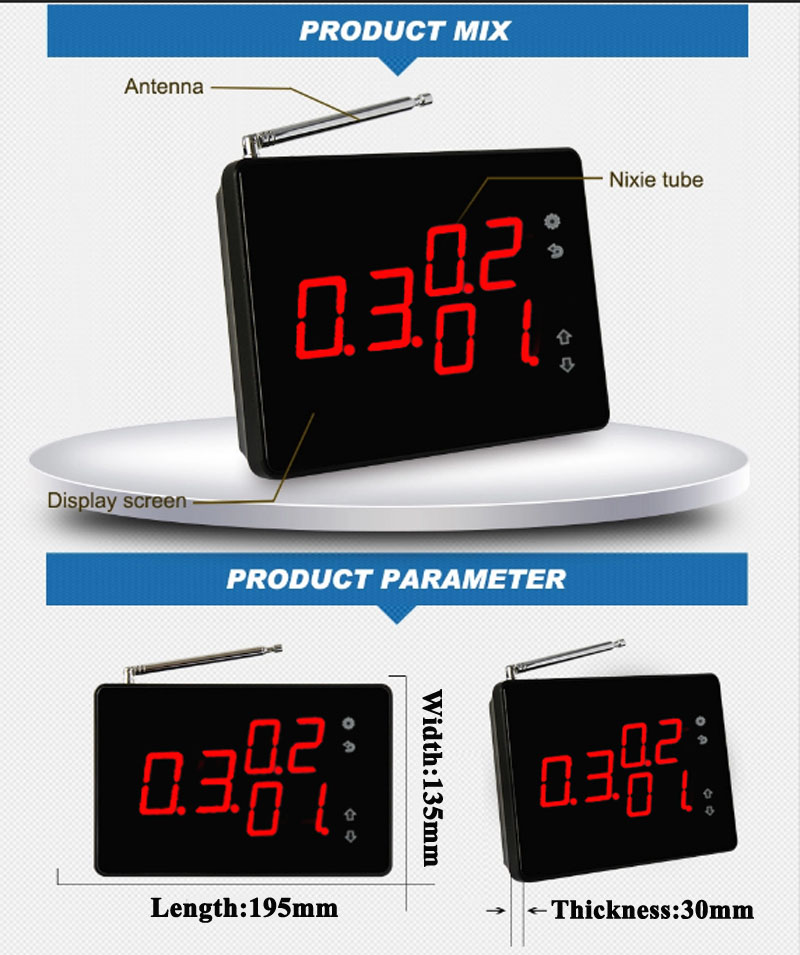 1. Pantalla del sistema de campana de llamada del paciente de frecuencia 433.92 mhz con carcasa de aleación de aluminio de alta resistencia 2. La pantalla de los sistemas de llamada a enfermeras puede mostrar 3 grupos de números al mismo tiempo 3. La pantalla de los sistemas de llamadas a enfermeras a domicilio muestra diferentes tipos de servicios: c para llamadas; b por factura; d para beber