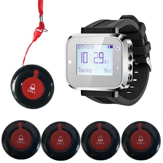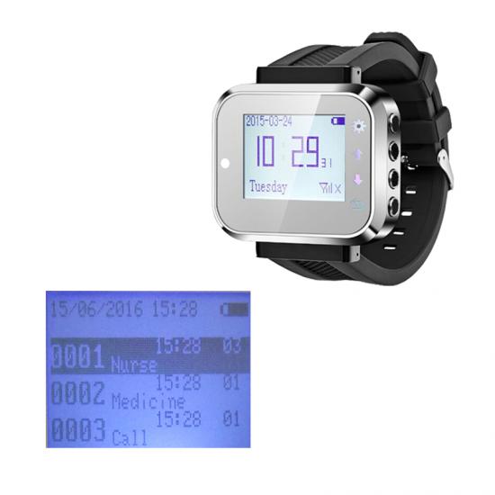 botón fijo en la cama o colgar en el cuello cuando necesite ayuda, presione el botón de llamada, luego el localizador de muñeca sonará, vibrará y mostrará el número. Después de recibir la llamada, la familia o el cuidador irán a la casa del anciano para verificar qué necesita o ayuda del anciano, esto es un muy conveniente botón de llamada para personas mayores o botón de llamada del paciente.