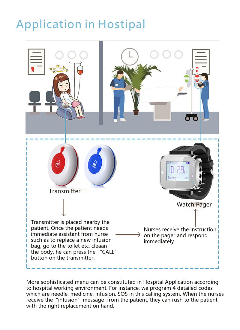 botones de llamada de emergencia instalados en salas o baños del hospital, receptores de pantalla instalados en la habitación del conserje o la enfermera estación, cuando los pacientes o el personal médico tienen molestias repentinas, simplemente presione los botones de llamada de emergencia, después de recibir la información de los receptores de pantalla, las personas de servicio van a la posición correspondiente para suministrar el servicio la primera vez。