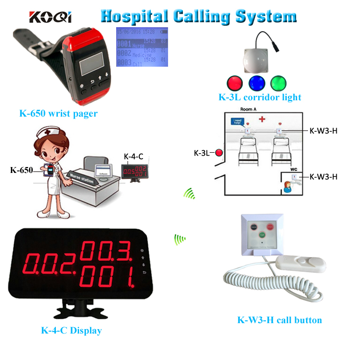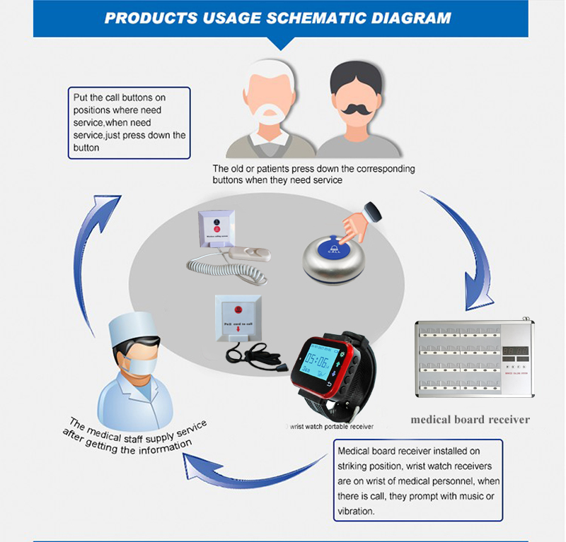 El sistema de llamada a la enfermera del hospital es ampliamente utilizado en el hospital, la clínica, el hogar de ancianos, etc. Consiste en un botón para uso del paciente y un receptor de señal para uso de la enfermera o el médico. cuando el paciente necesita ayuda, solo presiona el botón, el número de cama se mostrará en el receptor de la pantalla con sonido "dingdong". para que la enfermera y el médico puedan ofrecer ayuda muy oportunamente.