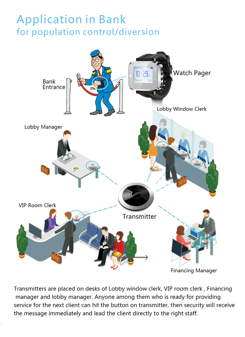 los transmisores se colocan en los escritorios de la ventana del vestíbulo empleado, VIP room clerk, Financiaciones gerente y lobby gerente. entre ellos para quien esta listo prestación de servicio para el próximo cliente puede presionar el botón del transmisor , luego, la seguridad recibirá el mensaje de inmediato y dirigirá al cliente directamente al personal adecuado.