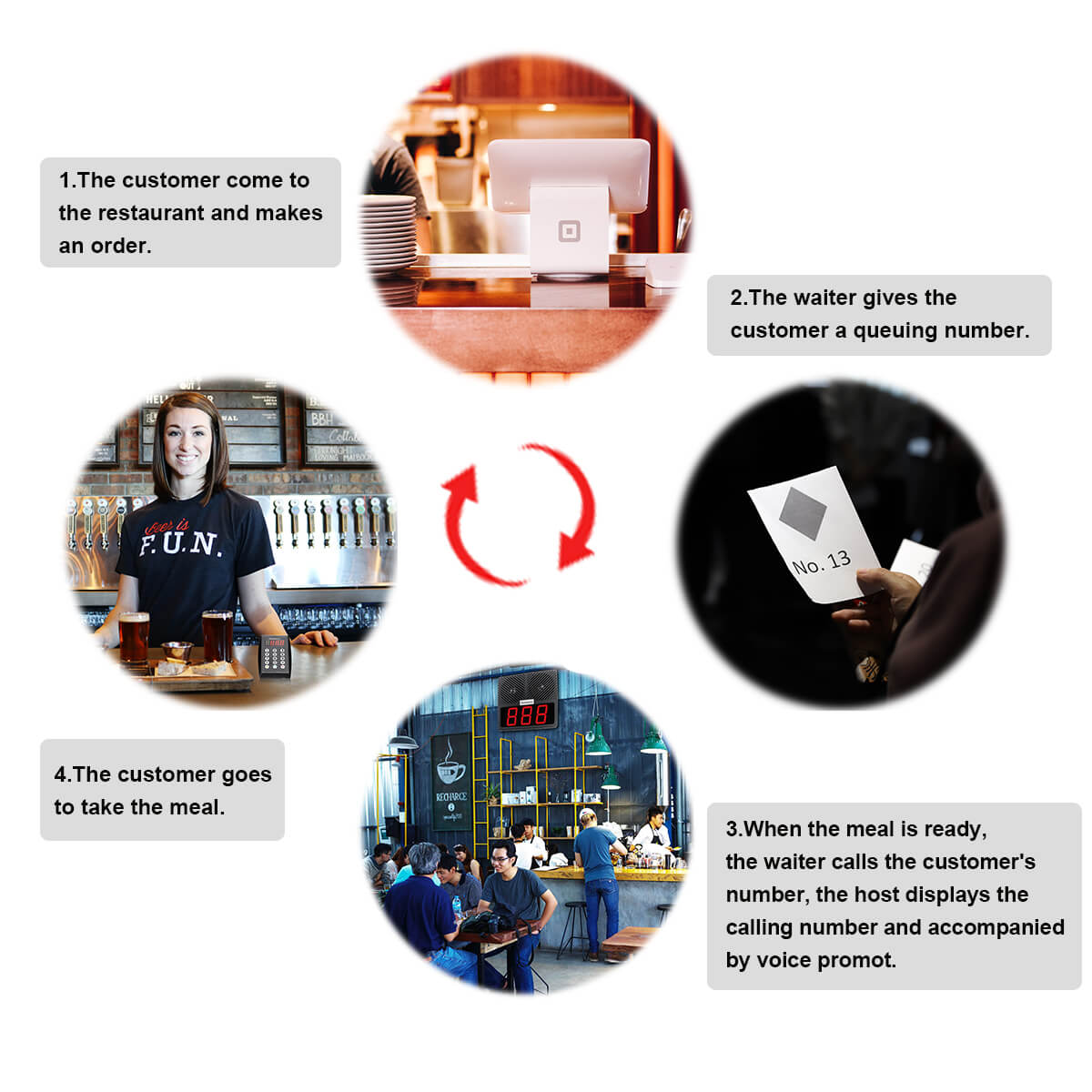 El sistema de llamada en cola consta del transmisor del teclado y la pantalla del receptor principal. El centro de alimentos aloja el teclado para presionar el número para llamar a los clientes para obtener su comida. Una vez que presione el número, el receptor, que está colgado en la pared, transmitirá el número mediante un mensaje de voz. Luego, el cliente irá a buscar la comida y la disfrutará.