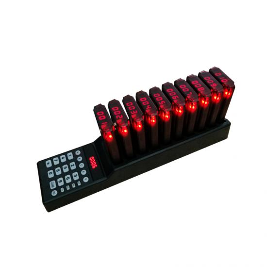 Un sistema de buscapersonas incluye 1 teclado y 20 buscapersonas el transmisor del teclado puede mostrar 3 dígitos número El receptor del buscapersonas puede colgarse del cuello El el dígito del buscapersonas muestra la luz en la parte superior