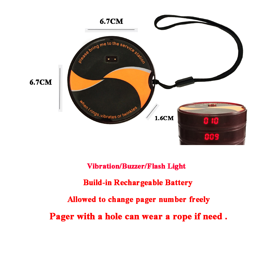Un sistema de localización de camareros incluye 1 teclado y 10 páginas el transmisor del teclado puede mostrar 4 dígitos número El receptor del buscapersonas puede colgarse del cuello El luz de demostración de dígitos del buscapersonas en el frente